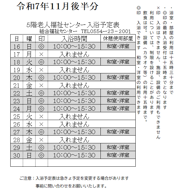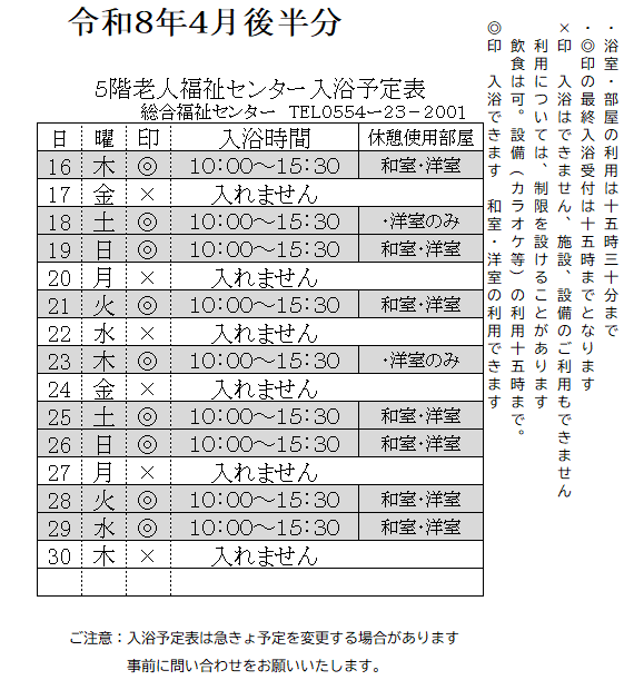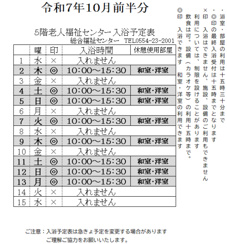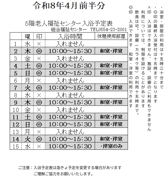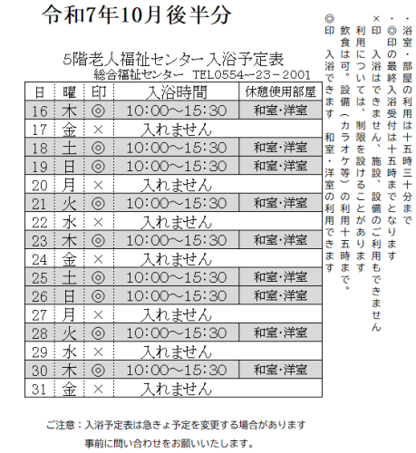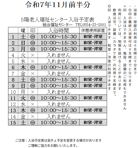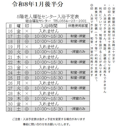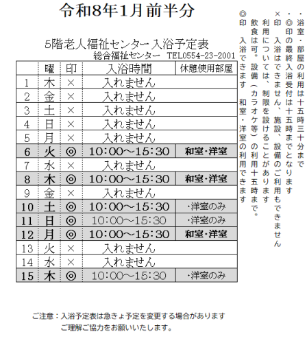 大月市総合福祉センター5階老人福祉センター浴室利用について 浴室使用料は次のとおりとなります。